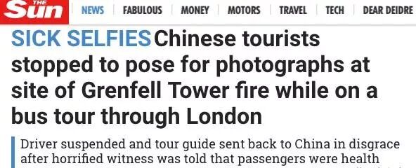 《太阳报》:“自拍病,中国游客在伦敦巴士游过程中,停至Grenfell Tower前自拍”