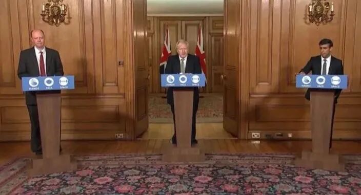 在当地时间晚7点,唐宁街举行疫情发布会,首相鲍里斯、财相苏纳克、首席医疗官惠蒂出席。