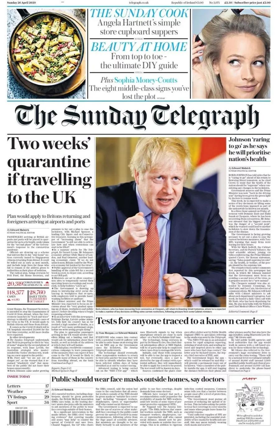 《星期日电讯报》头版头条:进入英国者,两周隔离期。