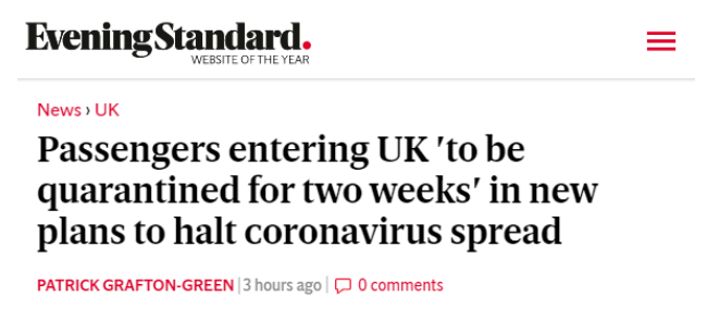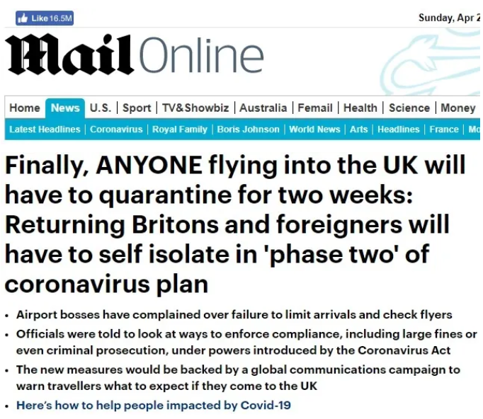 《星期日邮报》:终于,任何入境英国的人士都将要隔离两周——在新冠应对计划“第二阶段”,回家的英国人和外国人都必须自我隔离。