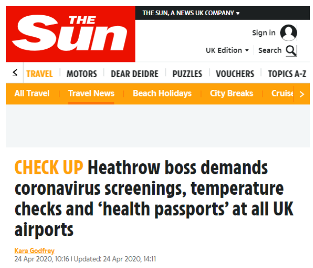 《太阳报》:检查!希思罗总裁呼吁在所有英国机场进行新冠筛查、体温检查,并实施“健康通行证”制度。